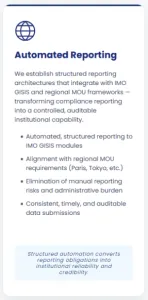 Automated Reporting: We establish structured reporting architectures that integrate with IMO GISIS and regional MOU frameworks - transforming compliance reporting into a controlled, auditable institutional capability