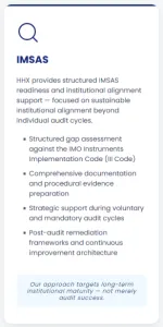 IMSAS: HHX provides structured IMSAS readiness and institutional alignment support - focused on sustainable institutional alignment beyond individual audit cycles.