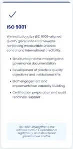 ISO 9001: We institutionalize ISO 9001 - aligned quality governance frameworks - reinforcing measurable process control and international credibility.