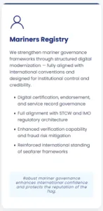 Mariner Registries: We strengthen mariner governance frameworks through structured digital modernization - fully aligned with international conventions and designed for institutional control and credibility.