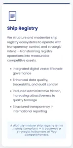 Ship Registry: We structure and modernize ship registry ecosystems to operate with transparency, control, and strategic intent - transforming registry operations into measurable competitive assets.